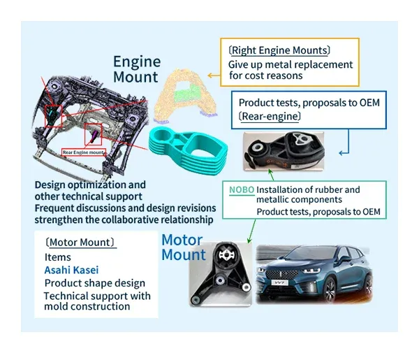 Nobo – ein Top-Player in China, der vor allem die großen chinesischen Automobilhersteller mit Komponenten beliefert – hatte aktiv nach Designstrategien gesucht, um Metallkomponenten durch Harzkomponenten zu ersetzen, um sowohl den Wert von Automobilkomponenten zu steigern als auch ihr Gewicht zu reduzieren. Asahi Kasei konnte eine breite Palette von Vorschlägen machen, um diese Bemühungen voranzutreiben.