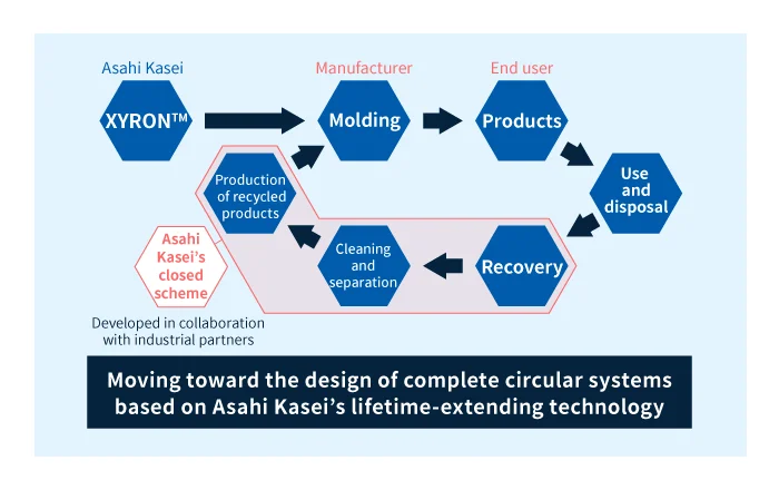 旭化成では、変性PPE樹脂 ザイロン™の製造時に、リサイクル原料を使いこなす技術・品質の確立、リサイクル後でも性能劣化しない技術の開発、オープンな協業体制の構築を推進しています。