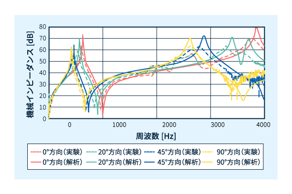 Đây là một ví dụ cho thấy tần số riêng có thể được thay đổi theo hướng sợi quang. Như được hiển thị trong Hình 5, sau khi tạo thành một tấm phẳng có kích thước 120mmx80mmx2mm, chúng tôi cắt nó ra theo từng hướng và tiến hành thử nghiệm đánh giá đặc tính giảm chấn bằng phương pháp kích thích trung tâm.